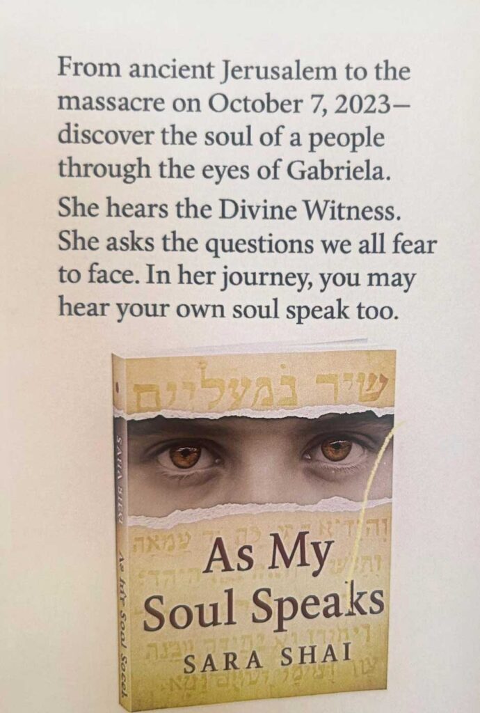 הרומן  As My Soul Speaks משלב היסטוריה ומיסטיקה ומציע עיון נוקב על הישרדות, מסירות ותקווה  * זהו ספרה השני של שרה שי, אמנית תושבת וודלנד הילס, המנסה לפענח: מהם שורשי האנטישמיות לאורך הדורות? מהו הקשר הקדוש שהחזיק את העם היהודי הנרדף בגלות? * המלצת קריאה