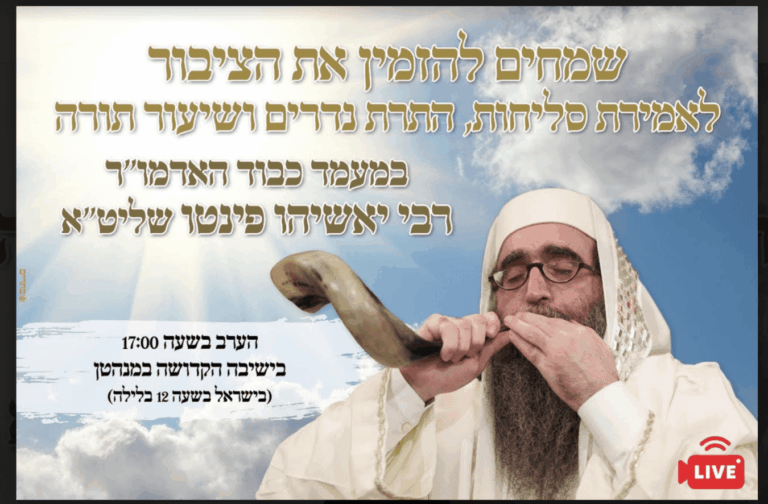 הציבור למעמד שיעור תורה – ולאחריו אמירת סליחות ומעמד התרת נדרים וקללות, בראשות כבוד האדמו״ר רבי יאשיהו פינטו שליט״א ראב"ד מרוקו.