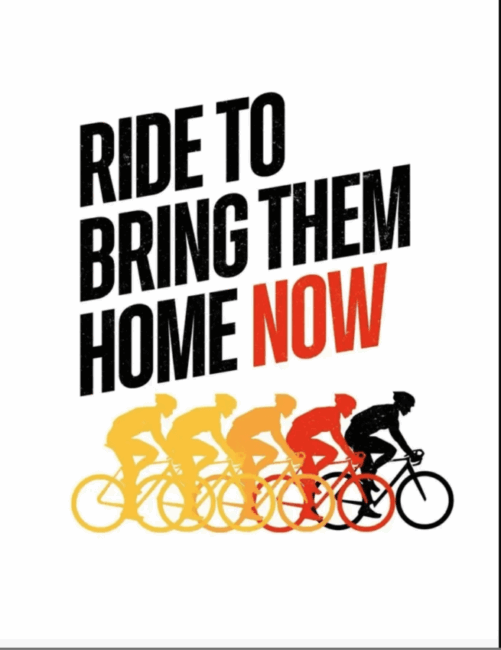 עשרות אלפי רוכבי אופניים ברחבי העולם יתאחדו למפגן רכיבת סולידריות חובק עולם למען החטופים בעזה. המפגן יתקיים סימולטנית בתל אביב ובשורה של ערים מרכזיות ברחבי העולם ב-14 לינואר – היום המאה לחטיפה.