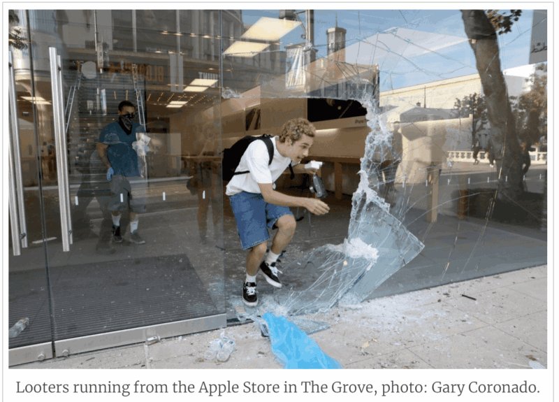 חנויות אפל, שהחלו לאחרונה להיפתח מחדש ברחבי ארצות הברית לאחר חודשים של סגירות בגלל המגיפה העולמית, דיווחו על וונדליזם וגניבה במספר מוקדים, כולל בלוס אנג'לס (הגרוב), ניו יורק, פילדלפיה ו-וושינגטון הבירה.