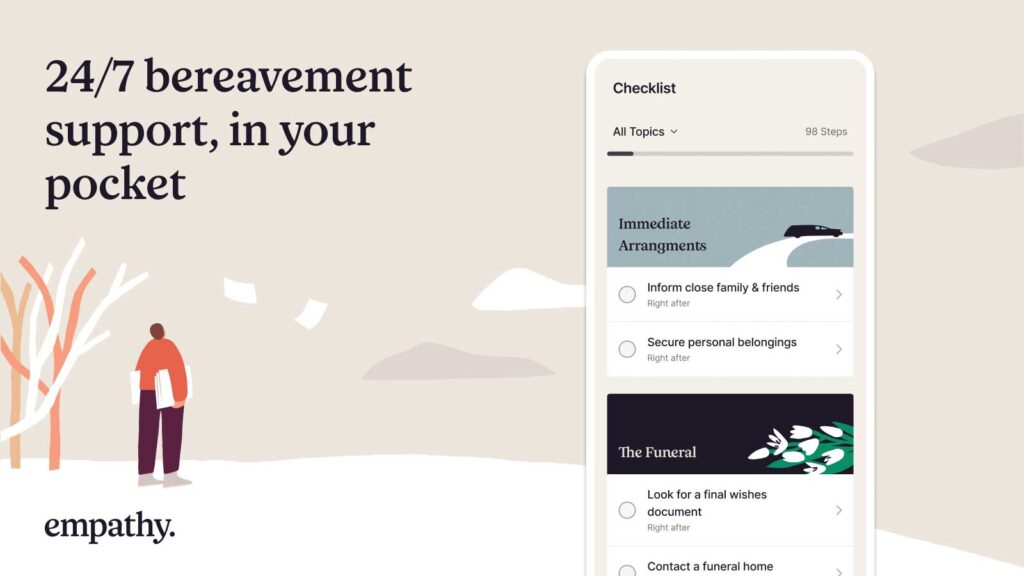 פונדר מספרת כי מעולם לא הספיקה להתכונן למוות של בעלה – לא רק נפשית אלא גם אדמיניסטרטיבית, "ידעתי שיום אחד אצטרך לדאוג לצוואות וחשבונות, אבל לא בגיל כזה, דחיתי את זה", היא מודה. למרבה המזל, היא אומרת, לפחות חלק מהנטל נחסך ממנה. כחלק מתנאי העבודה שלה ב-AT&T היא קיבלה גישה לשירות של סטארט-אפ ישראלי בשם אמפת'י (Empathy), שעוזר לאנשים לנהל את הנטל הלוגיסטי והרגשי של המוות. מלבד שיחות וידאו שבועיות עם עובדת סוציאלית שסיפקה אמפת'י דרך האפליקציה שלה, פונדר קיבלה רשימת מטלות שנתפרה למצבה הפרטי ובהן סיוע בתכנון ההלוויה, מילוי טפסים חצי-אוטומטי שהיא הדפיסה והגישה לבית המשפט ללא עורך דין – כדי שיספק אישור בהיעדר צוואה (Probate).