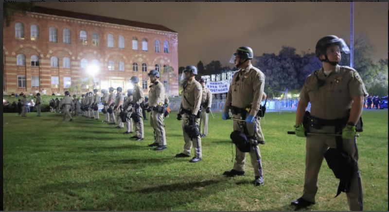 בתוך כך, גם בקמפוס של UCLA בלוס אנג'לס בלטה מעורבותן של חברות אבטחה עם זיקה ישראלית בהתנגשויות האלימות שאירעו בקמפוס במאי האחרון. הסטודנטים המוחים דיווחו אז כי מאבטחים של חברת "מגן עם", בעלי רקע צה"לי תקפו אותם באגרסיביות. באוניברסיטה הציבורית הודו כי החברה פעלה בשיתוף פעולה עם המשטרה המקומית, ונשכרה על ידי המוסד כדי להתמודד עם ההפגנות. עבור השירות הזה היא קיבלה מיליון דולר מכספי העירייה. גם חברות האבטחה האמריקנית Contemporary Services Corporation (CSC), שלה שלוחה בלעדית בישראל, נשכרה לפעול בקמפוס ובמוקדי הפגנות ברחבי העיר.