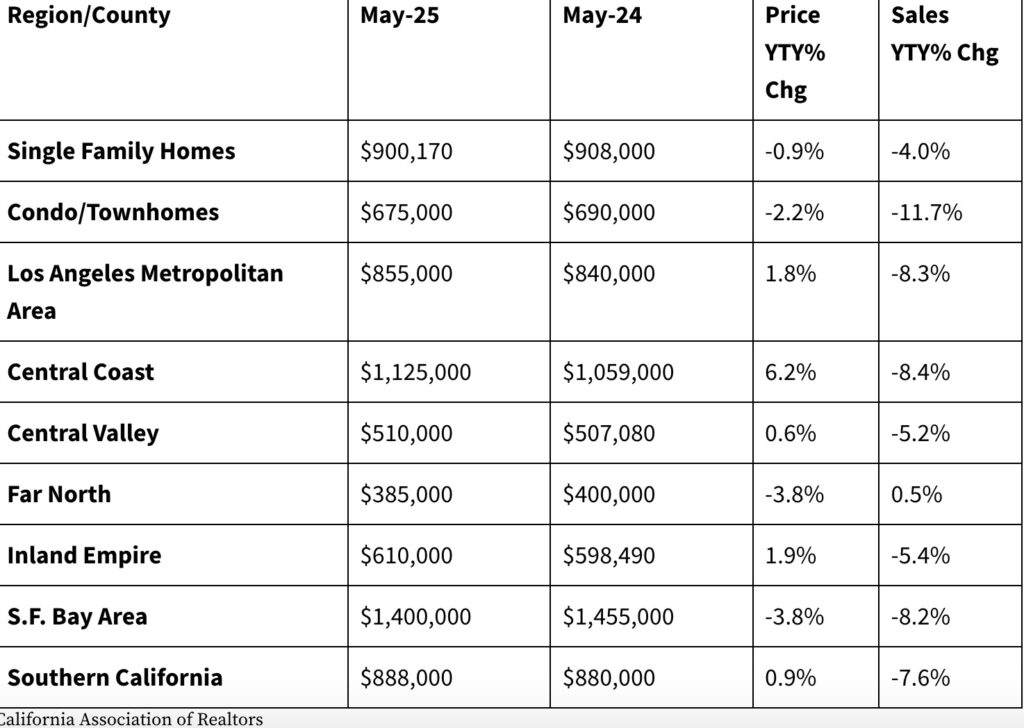 מחירי הבתים בקליפורניה נעים בדרך כלל בכיוון אחד בלבד: עלייה. עם זאת, הנתונים האחרונים של איגוד סוכני הנדל"ן של קליפורניה מראים שמדובר בהכל – חוץ מקו ישר. המחיר החציוני של בית פרטי בחודש מאי היה 900,170 דולר, נמוך בכ-1% מהמחיר החציוני של 908,000 דולר במאי 2024. זו הייתה הירידה הראשונה משנה לשנה מזה 23 חודשים, כך מסרה האיגוד.