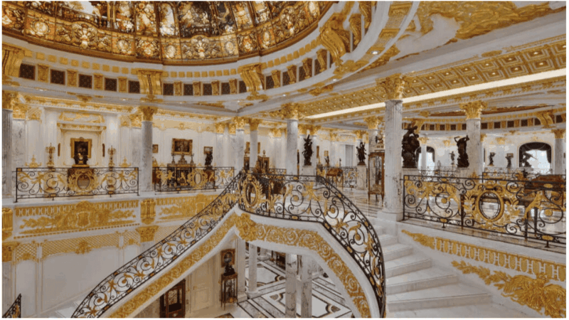 כחלק מעבודות הבנייה קושט הנכס ב-700 אלף עלי זהב על ידי 70 עובדים מיומנים שעמלו על כך במשך תשעה חודשים, ציין משרד התיווך. בבית מוצבות כעת כ-400 יצירות אמנות מהאוסף הפרטי של הבעלים, מרביתן פסלים וציורים בני המאה ה-19 וה-20. הבעלים מוכן לנהל מו"מ על הכללתן בעסקה.