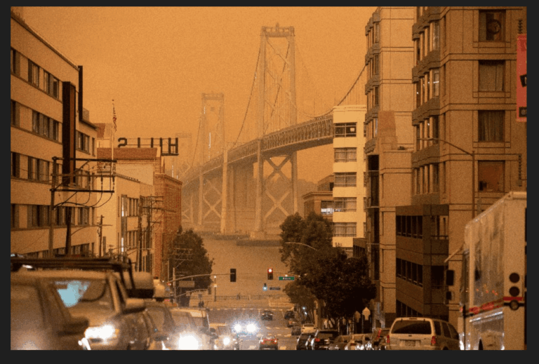 השריפות בקליפורניה, באורגון ובוושינגטון יוצרות ענן עשן ענק מעל החוף המערבי, ותושבים רבים התעוררו בבוקר למראות אפוקליפטיים – עם שמיים כתומים-אדומים שהסתירו את השמש. באזור סן פרנסיסקו הפנסים בכבישים המהירים נשארו דלוקים גם לאורך היום. למרות ענן העשן זיהום האוויר לא הגיע שם לרמה מסוכנת לפי הרשויות, אם כי שירות מזג האוויר המקומי הזהיר שבהמשך המצב עלול להחמיר.