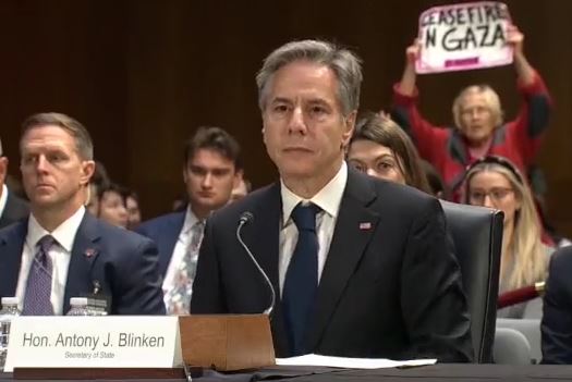 פרובוקציה במהלך נאום מזכיר המדינה האמריקאי אנטוני  בלינקן בסנאט: במהלך דיון שהתקיים בוושינגטון, בין היתר על הסיוע האמריקאי לישראל ולאוקראינה, התפרצו מפגינים פרו פלסטינים בזמן נאומו של שר החוץ בלינקן וקראו לעצור את "הטבח בעזה". המפגינים נכנסו לאולם עם שלטים, קשרו את ידיהם שהיו צבועות באדום, צעקו וקראו להפסקת אש. בלינקן התקשה להמשיך לדבר ועצר את נאומו עד שכוחות ביטחון הוציאו את המפגינים מהאולם.