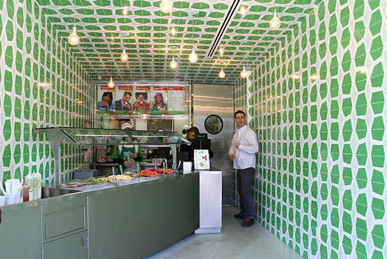 ביום השלישי, לאחר בירורים ובדיקות, נאמר לי כי חובה עלי לפקוד את הפאלפל הטוב ביותר על אי השדים. אי לכך גררו אותי רגלי אל מהעבר השני של הרחוב 72 לפלאפל "שומשום". "אף פעם לא חשבתי שאמכור פלאפל בניו יורק", אומר לי הבעלבית, שלומי לוי. "אני פותח עוד סניף ועוד אחד", הוא עלה על הרעיון לפתוח בר צמחוני, עם פלאפל, וחומוס וסביח. "הבאתי הנה את הדוד שלי, מאני, שמנהל דוכני פלאפל בטבריה וברמת גן. הוא היה פה שלושה שבועות והחליט להביא משהו אותנטי מטבריה. הוא לימד אותנו את המתכונים וככה בנינו את התפריט".21_maozinside_lg
