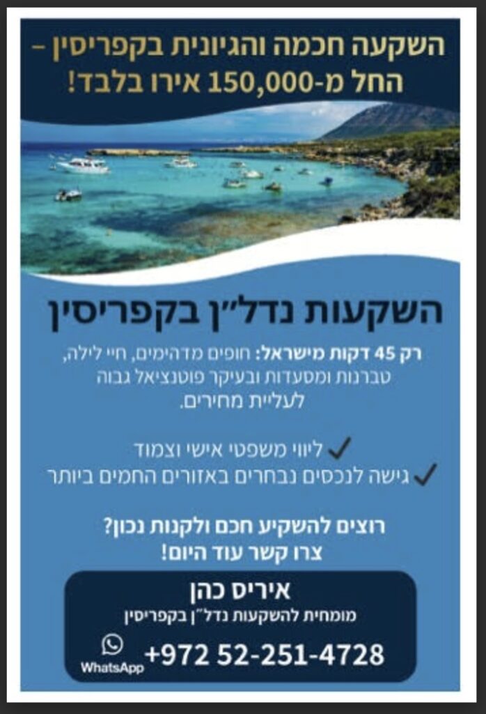 "אל תסתכלו על זה רק כנדל"ן. פאפוס היא 'חוף המבטחים' שלכם. מקום שבו האנגלית שגורה בפי כולם, הביטחון האישי הוא מעל הכל, והאנרגיה היא של חופש אינסופי. זו ההזדמנות שלכם להשקיע בנכס מניב ובו בזמן להבטיח לעצמכם בית שני – הכי קרוב לישראל, הכי רגוע שיש."