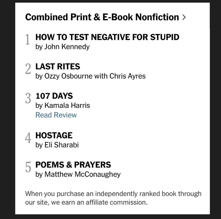 בטבלת רבי המכר של הניו יורק טיימס מקדימים את ״חטוף״ ספרו ההומוריסטי של הסנטור הרפובליקני ג'ון קנדי, ספרה של קמלה האריס "107 ימים" וספר על חייו של הרוקר הבריטי אוזי אוסבורן.