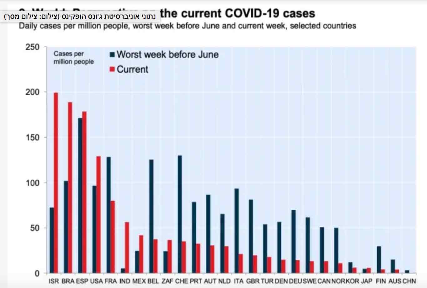 על פי דו"ח אוניברסיטת ג'ונס הופקינס בוושינגטון שפורסם ביום חמישי שעבר ובדק את ממוצע הנדבקים החדשים היומי בשבוע האחרון, ישראל מובילה את טבלת המדינות ביחס לגודל האוכלוסיה עם ממוצע של 199.3 נדבקים חדשים למיליון נפש בכל אחד מהימים בשבוע האחרון. מיד אחריה ברזיל, עם ממוצע של 188.8 ואחריהן ספרד, ארה"ב וצרפת. לשם ההשוואה האירונית והמדאיגה, בסין הממוצע עומד על 0 (אם להאמין לנתונים המגיעים משם) ובאיטליה על 21.3.
