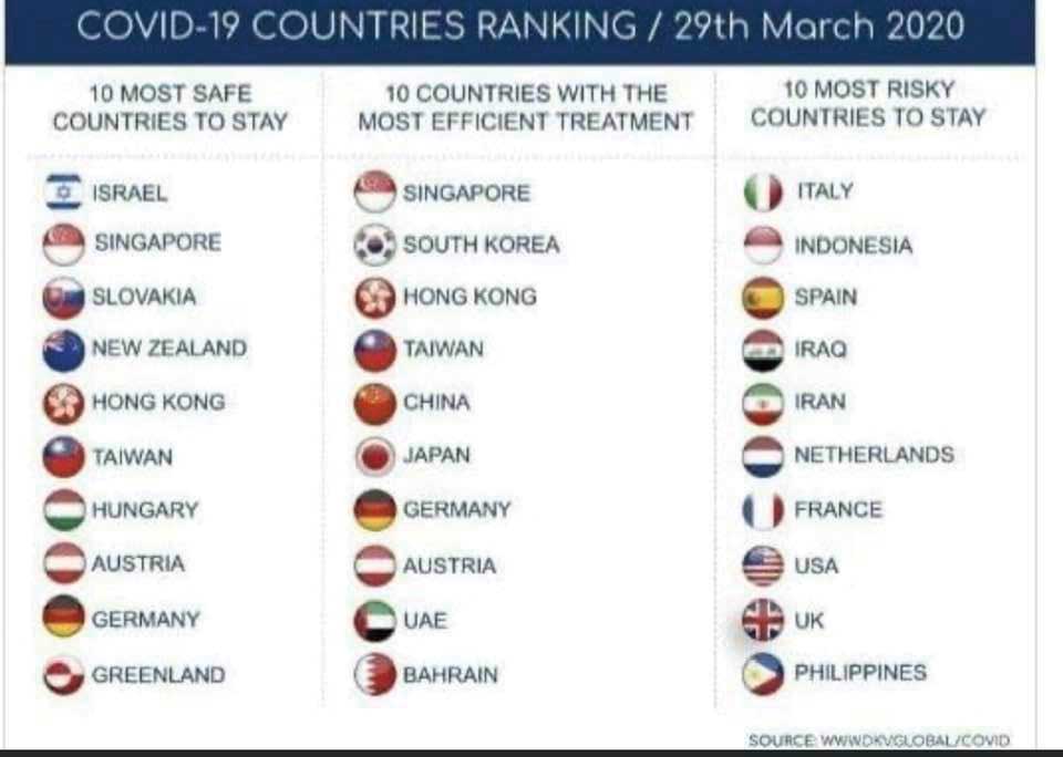 מה מצבה של ישראל מבחינת ההתמודדות עם וירוס הקורונה? השאלה העדינה הזו אינה כה פשוטה כיוון שהיא תלויה בתאריך ובכמות אירועי הדבקה, אשר אינם תמיד נחזים בגרפים. משרד ראש הממשלה בירושלים עידכן השבוע כי מומחים השייכים לקבוצת הארגונים הבינלאומית Deep Knowledge Group העריכו כי ישראל היא המדינה הבטוחה ביותר בעולם מבחינה בריאותית ביחס לווירוס הקורונה, אפילו יותר מסינגפור. עם זאת, מדובר בגרף שלא הובררה המתודולוגיה שעומדת בבסיסו. ישראל נעדרת מגרפים אחרים העוסקים בסכנה לחלות בקורונה, וגם במקביל המדינה נעדרת מהגרף המדרג את מערכות הבריאות של כלל מדינות העולם.