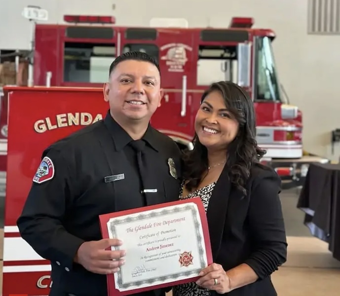 הכבאי שהואשם ברצח אשתו בגרזן לאחר שלכאורה נודע לו שהיא בוגדת, כפר באשמה בבית משפט בלוס אנג'לס ביום רביעי, כאשר משפחתה וחבריה של האישה המנוחה הגיעו בהמוניהם. כבאי תחנת גלנדייל, אנדרו חימנז, בן 45, הואשם ברצח אשתו, מיירה חימנז, בת 46, בגין אלימות במשפחה, לאחר שנמצאה מוכה למוות בביתם של בני הזוג בנורת' הוליווד ב-21 בינואר (בתצלום: אנדרו ומיירה חימנז מחזיקים בתעודת קידום ממחלקת הכבאות של גלנדייל).