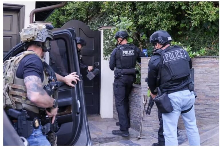 תמונות ממעצר יום חמישי ששותפו על ידי משטרת לוס אנג'לס הראו חברי מחלקות השוד, הרצח, הכנופיות והסמים מתקרבים לבית ברחוב מוקף עצים כשהם עוטים ציוד טקטי ונושאים רובים. בתמונה אחת נראה שוטר משתמש באיל ניגוח ידני כדי לפרוץ את שער הכניסה.