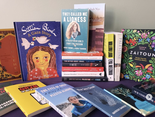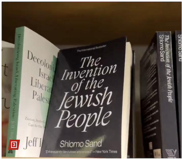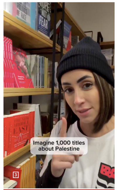 אישה בכובעת שחורה וחולצה לבנה ארוכת שרוולים מחווה בקליפ לעבר מדף ספרים הכולל ספר אדום בולט שכותרתו "המזרח התיכון החדש", עם הכיתוב "דמיינו 1,000 כותרים על פלסטין".היזמית והאקטיביסטית מרי נזאל הודיעה על הגעתה של חנות הספרים הפלסטינית הראשונה לארה"ב: "דמיינו 1,000 כותרים על פלסטין ומאבקי שחרור אחרים, כולם תחת קורת גג אחת", צעקה היזמית/אקטיביסטית מרי נזאל בסרטון.
