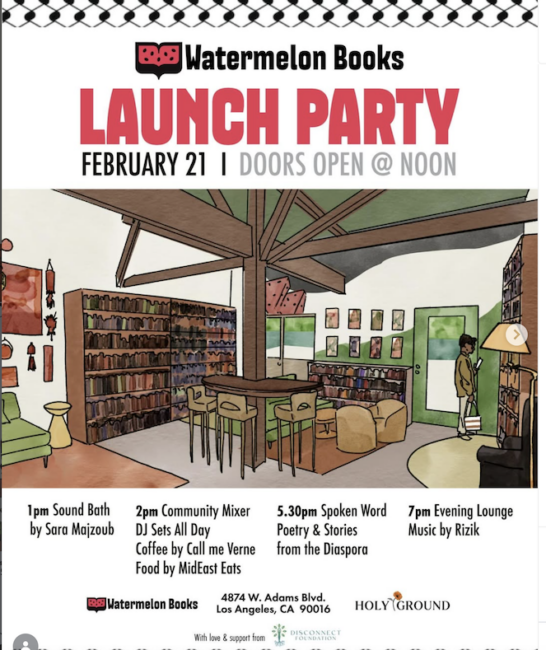 חנות הספרים הפלסטינית הראשונה של אמריקה נפתחת בלוס אנג'לס. הוצאת Watermelon Books הודיעה על השקתה ביום שבת במרכז התרבות Holy Ground בשדרות ווסט אדמס בדרום העיר וכינתה אותה "מעשה התנגדות תרבותי" בקליפ שקידם את הפתיחה.