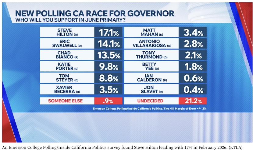 הפרשן השמרני סטיב הילטון מוביל כעת את המירוץ למשראת מושל קליפורניה עם 17%, ואחריו חבר הקונגרס הדמוקרטי אריק סוואלוול ושריף מחוז ריברסייד צ'אד ביאנקו, רפובליקני, עם 14%, על פי סקר של Emerson College Polling/Inside California Politics בקרב 1,000 מצביעים פוטנציאליים שפורסם ביום רביעי.