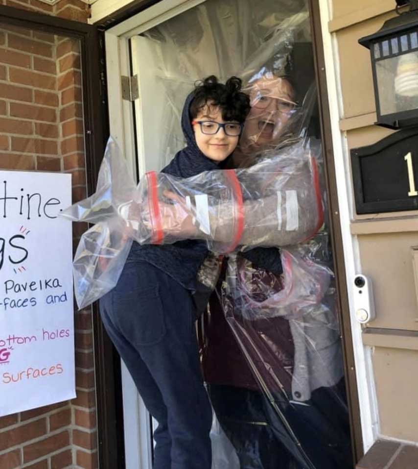 תושבת קנדה שהתגעגעה נואשות לחיבוק של אמה בתקופת הסגר לקחה יריעת פלסטיק אטום למים ויצרה ממנו מעין כפפת חיבוק עם שרוולים, וכך הצליחו שתי הנשים להתחבק בלי לחשוש מהקורונה. סרטון וידיאו של שני בני דודים מקנטקי מתחבקים ומתייפחים לאחר בידוד ארוך זכה לאלפי שיתופים. "לא ציפינו שהם יגיבו כך", אומרת אמבר קולינס, שצילמה את המפגש בין בנה הקסטון בן השמונה לבין בת הדוד רוזלינד ארנט בת העשר. "הם שמחו כל כך ולא ידעו איך להביע את עצמם, אז הם פשוט בכו. החיבוק הזה מוכיח עד כמה חשוב המגע האנושי".